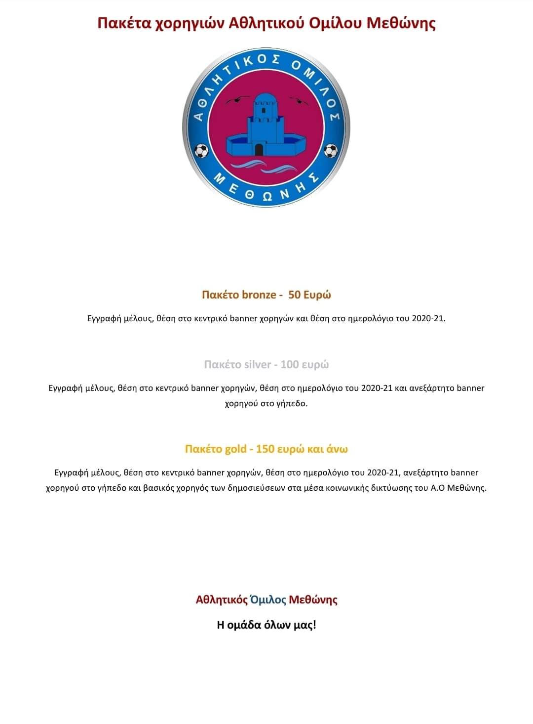 Ο Α.Ο Μεθώνης ανακοινώνει τα πακέτα χορηγιών και διαφήμισης των επιχειρήσεων που στηρίζουν την ομάδα για την αγωνιστική περίοδο 2020-21.