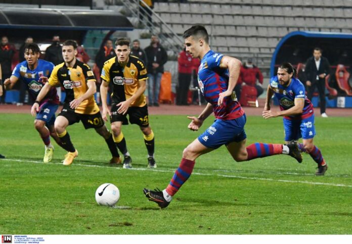 Κυρίαρχη στο α΄ ημίχρονο, η ομάδα της Μαγνησίας άνοιξε το σκορ στις καθυστερήσεις με πέναλτι του Δουβίκα. Την παράβαση κέρδισε ο Περέα σε ανατροπή του από τον Μιτάι. Στο διάστημα που προηγήθηκε, μόνο από τις φανέλες θα μπορούσε να συμπεράνει κάποιος ότι η ΑΕΚ είναι η θεωρητικά «μεγάλη» ομάδα.