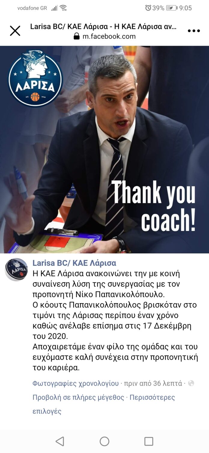 Παρελθόν από την τεχνική ηγεσία της Λάρισας αποτελεί ο καλαματιανός τεχνικός Νικόλας Παπανικολόπουλος. Η διοίκηση του συλλόγου ανακοίνωσε πριν από λίγο την κοινή συναίνεση λύση της συνεργασίας με τον έμπειρο τεχνικό ο οποίος βρισκόταν στο τιμόνι του συλλόγου για περίπου 1 χρόνο.