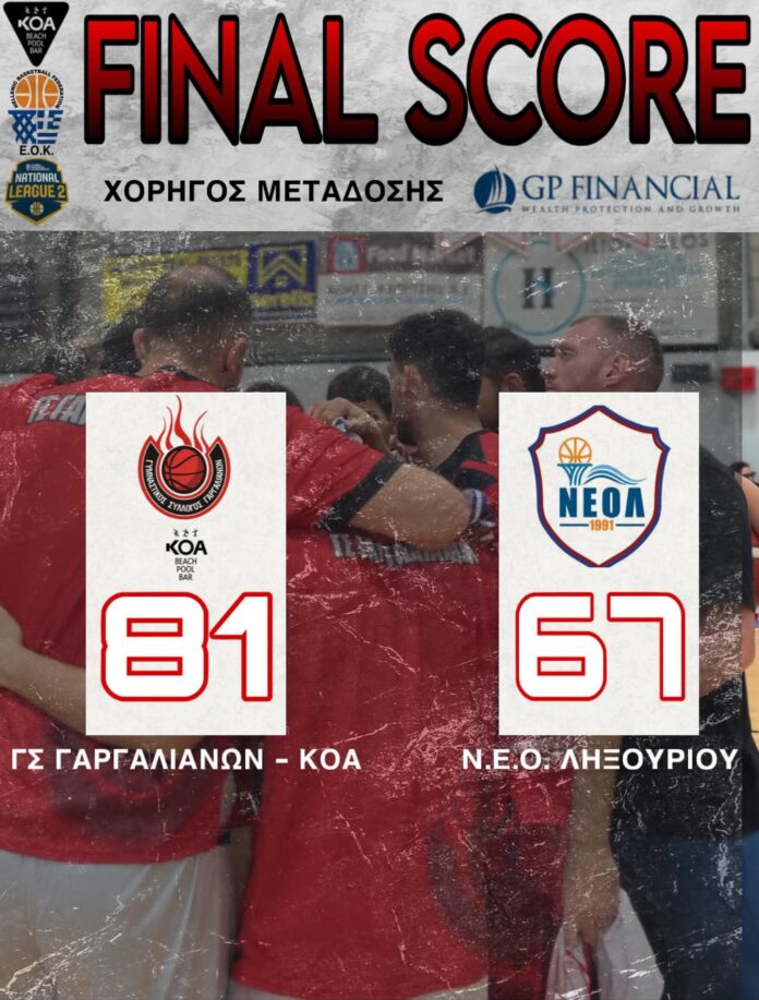 Ανεπηρέαστος από τραυματισμούς και απουσίες ο ΓΣ Γαργαλιάνων έκαμψε την αντίσταση του ισχυρού και σκληροτράχηλου ΝΕΟ Ληξουρίου, φτάνοντας στη νίκη με σκορ 81-67 και συνεχίζει με θετικά αποτελέσματα στο ξεκίνημα της σεζόν. Η αλήθεια είναι ότι η ομάδα του Χρήστου Γκαβανόπουλου δυσκολεύθηκε αρκετά μέχρι το τέλος του τρίτου δεκαλέπτου, έχοντας προβλήματα στην άμυνα, ωστόσο κάπου εκεί ανέβασε στροφές βάζοντας τέλος στις… ορέξεις του συλλόγου της Κεφαλονιάς. Ρόλο στην θετική έκβαση του αγώνα έπαιξε κυρίως η βελτίωση της αμυντικής εικόνας του μεσσηνιακού συλλόγου, καθώς δέχθηκε μόλις 24 πόντους στην επανάληψη, όπως επίσης και η επιθετική του πολυφωνία. ΓΣ Γαργαλιάνων-ΝΕΟ Ληξουρίου 81-67. Διαιτητές: Θεοδοσόπουλος-Μακρής-Γκούμας. Δεκάλεπτα: 25-19, 40-43, 60-54, 81-67. Γαργαλιάνοι (Γκαβανόπουλος): Τασσόπουλος 12(2), Βουκίσεβιτς 15(2), Γυφτάκης 11(2), Δαμιανάκος 19(3), Μακαριάδης 15(1), Νικολιδάκης 6, Γαβρίλης 2, Καστανιώτης 1, Ντεμερούκας, Αρβανίτης, Σοφιανόπουλος. Ληξούρι (Τζουγανάτος): Σιπητάνος 12(2), Ιωαννίδης 18, Τσούκας 6, Καραπιπέρης 10(2), Καψάλης 6(2), Μαρούλης 10, Συνοδινός-Χούσος 5(1), Χοξχάι, Μοσχόπουλος.